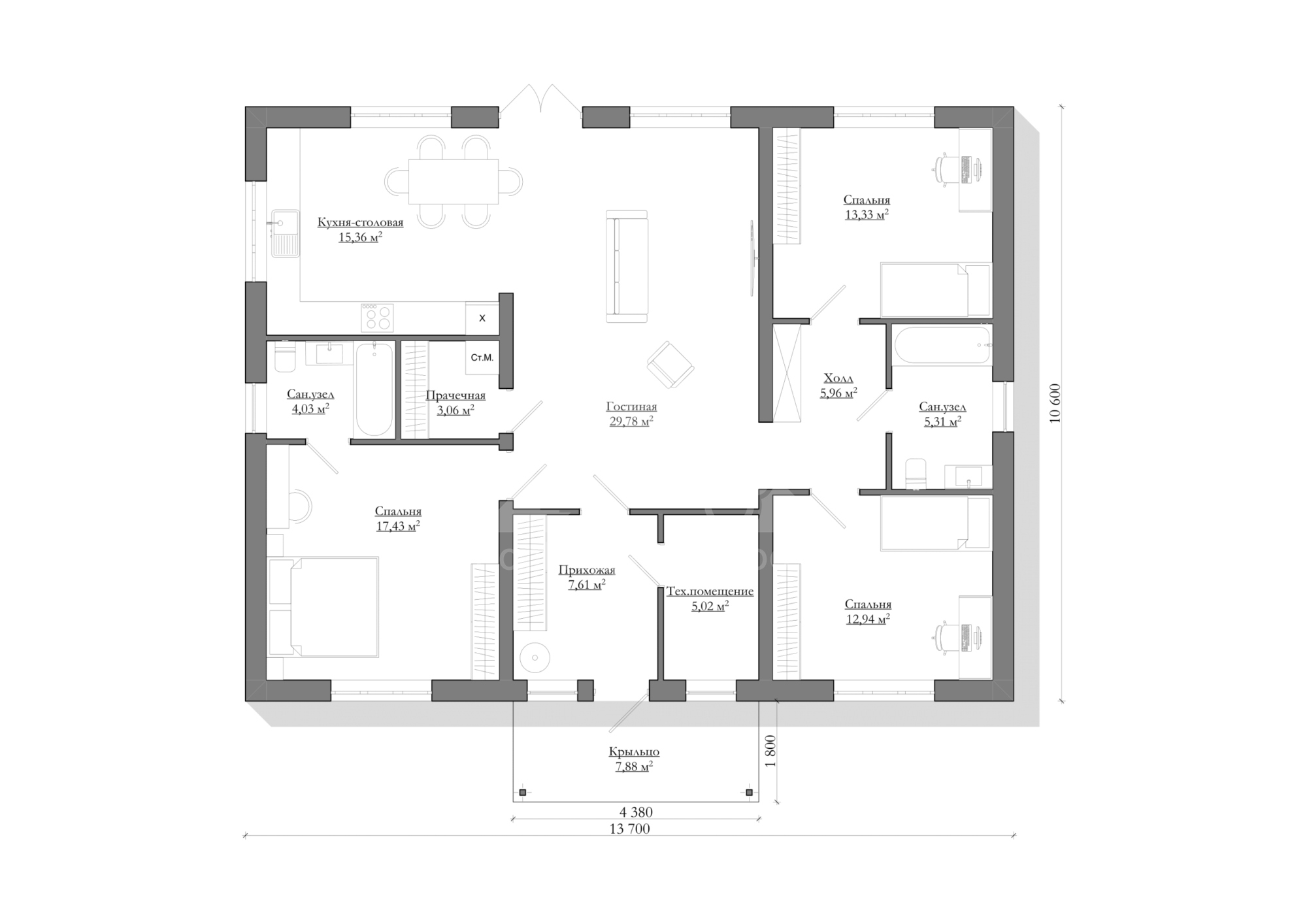 Номер объекта - 1695 Предлагаем к продаже проект одноэтажного дома 151 м². (Стоимость без участка) Отличный вариант для тех, кто планирует комфортное загородное проживание в спокойном и живописном месте. Готовы подробно ответить на все вопросы и предоставить дополнительную информацию. Звоните — будем рады помочь! В "Базовую" комплектацию дома входит полный закрытый теплый контур: • Подготовительные работы - Проект дома; Документы для БТИ; Оценка стройплощадки • Фундамент (зависит от участка) • Несущие стены газоблок / керамоблок / кирпич • Монолитный пояс • Перекрытия - Ширина плит перекрытия: 1-1,5м; Длина до 9 м.; Утепление торцов плит; Заделка швов • Утепленная кровля из металлочерепицы • Окна двухкамерные с тройным стеклопакетом • Металлическая входная дверь с зимним утеплителем Если вас заинтересовал дом — обращайтесь за подробностями. Всегда рады помочь. Помощь в получении кэшбека при покупке недвижимости, ипотеки, реализации материнского капитала и сертификатов. Гарантируем безопасность сделки.