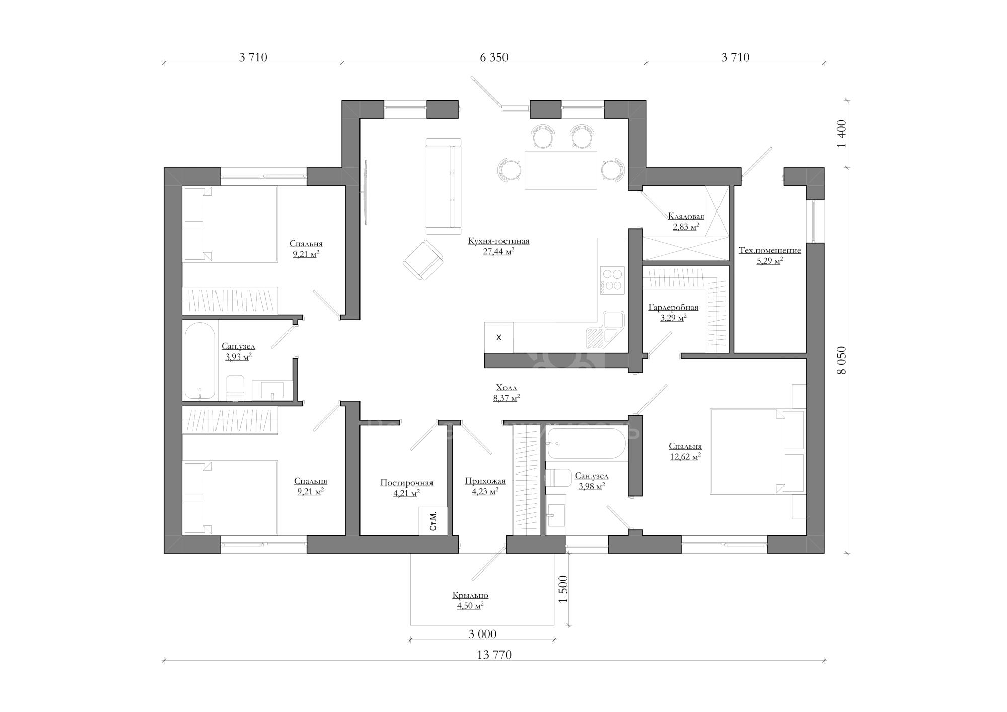 Номер объекта - 1707 Предлагаем к продаже авторский проект одноэтажного дома С-14 124 м². (Стоимость без участка) Отличный вариант для тех, кто планирует комфортное загородное проживание в спокойном и живописном месте. Готовы подробно ответить на все вопросы и предоставить дополнительную информацию. Звоните — будем рады помочь! В "Базовую" комплектацию дома входит полный закрытый теплый контур: • Подготовительные работы - Проект дома; Документы для БТИ; Оценка стройплощадки • Фундамент (зависит от участка) • Несущие стены газоблок / керамоблок / кирпич • Монолитный пояс • Перекрытия - Ширина плит перекрытия: 1-1,5м; Длина до 9 м.; Утепление торцов плит; Заделка швов • Утепленная кровля из металлочерепицы • Окна двухкамерные с тройным стеклопакетом • Металлическая входная дверь с зимним утеплителем Если вас заинтересовал дом — обращайтесь за подробностями. Всегда рады помочь. Помощь в получении кэшбека при покупке недвижимости, ипотеки, реализации материнского капитала и сертификатов. Гарантируем безопасность сделки.