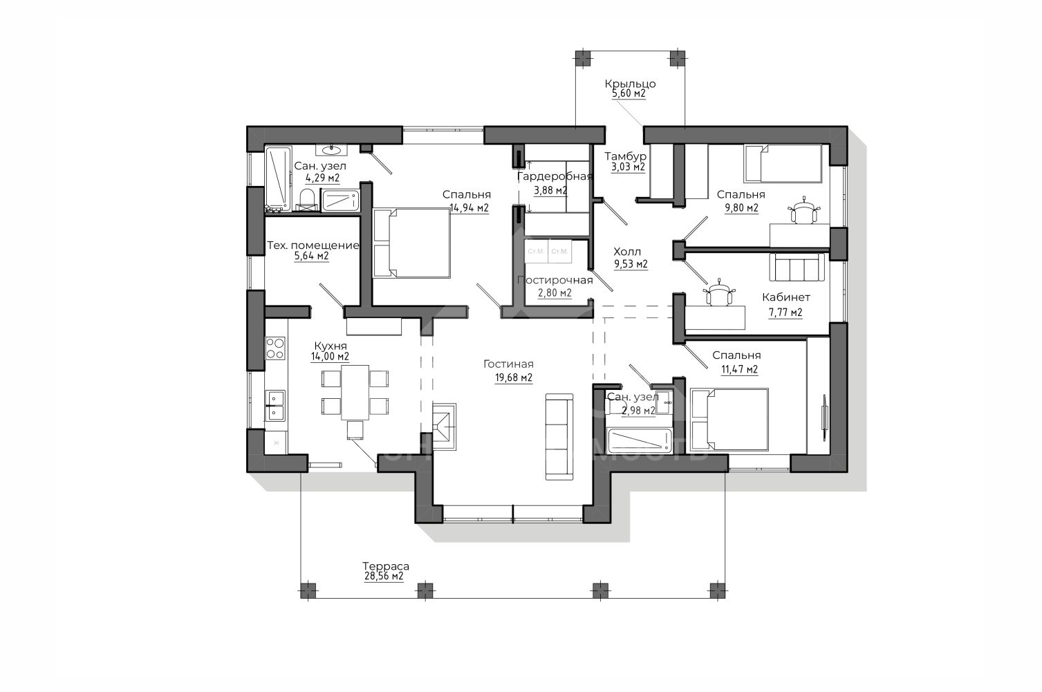 Номер объекта - 1717 Предлагаем к продаже авторский проект одноэтажного дома С-29 164 м². (Стоимость без участка) Отличный вариант для тех, кто планирует комфортное загородное проживание в спокойном и живописном месте. Готовы подробно ответить на все вопросы и предоставить дополнительную информацию. Звоните — будем рады помочь! В "Базовую" комплектацию дома входит полный закрытый теплый контур: • Подготовительные работы - Проект дома; Документы для БТИ; Оценка стройплощадки • Фундамент (зависит от участка) • Несущие стены газоблок / керамоблок / кирпич • Монолитный пояс • Перекрытия - Ширина плит перекрытия: 1-1,5м; Длина до 9 м.; Утепление торцов плит; Заделка швов • Утепленная кровля из металлочерепицы • Окна двухкамерные с тройным стеклопакетом • Металлическая входная дверь с зимним утеплителем Если вас заинтересовал дом — обращайтесь за подробностями. Всегда рады помочь. Помощь в получении кэшбека при покупке недвижимости, ипотеки, реализации материнского капитала и сертификатов. Гарантируем безопасность сделки.