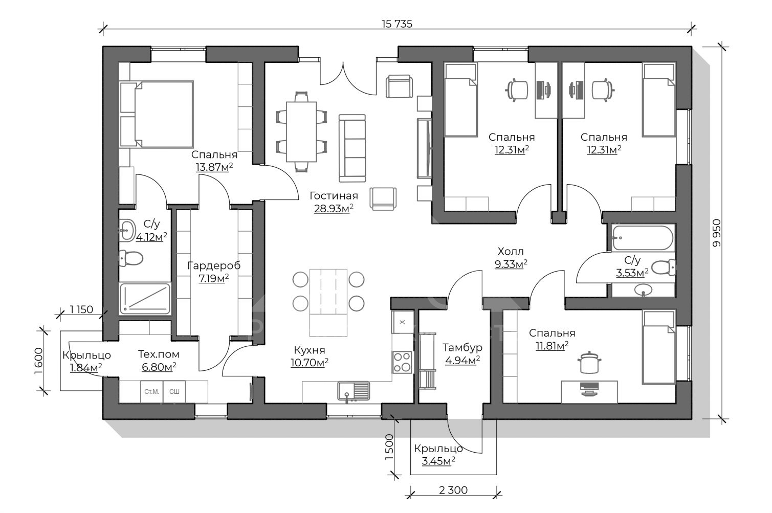 Номер объекта - 1718 Предлагаем к продаже авторский проект одноэтажного дома С-28 162 м². (Стоимость без участка) Отличный вариант для тех, кто планирует комфортное загородное проживание в спокойном и живописном месте. Готовы подробно ответить на все вопросы и предоставить дополнительную информацию. Звоните — будем рады помочь! В "Базовую" комплектацию дома входит полный закрытый теплый контур: • Подготовительные работы - Проект дома; Документы для БТИ; Оценка стройплощадки • Фундамент (зависит от участка) • Несущие стены газоблок / керамоблок / кирпич • Монолитный пояс • Перекрытия - Ширина плит перекрытия: 1-1,5м; Длина до 9 м.; Утепление торцов плит; Заделка швов • Утепленная кровля из металлочерепицы • Окна двухкамерные с тройным стеклопакетом • Металлическая входная дверь с зимним утеплителем Если вас заинтересовал дом — обращайтесь за подробностями. Всегда рады помочь. Помощь в получении кэшбека при покупке недвижимости, ипотеки, реализации материнского капитала и сертификатов. Гарантируем безопасность сделки.
