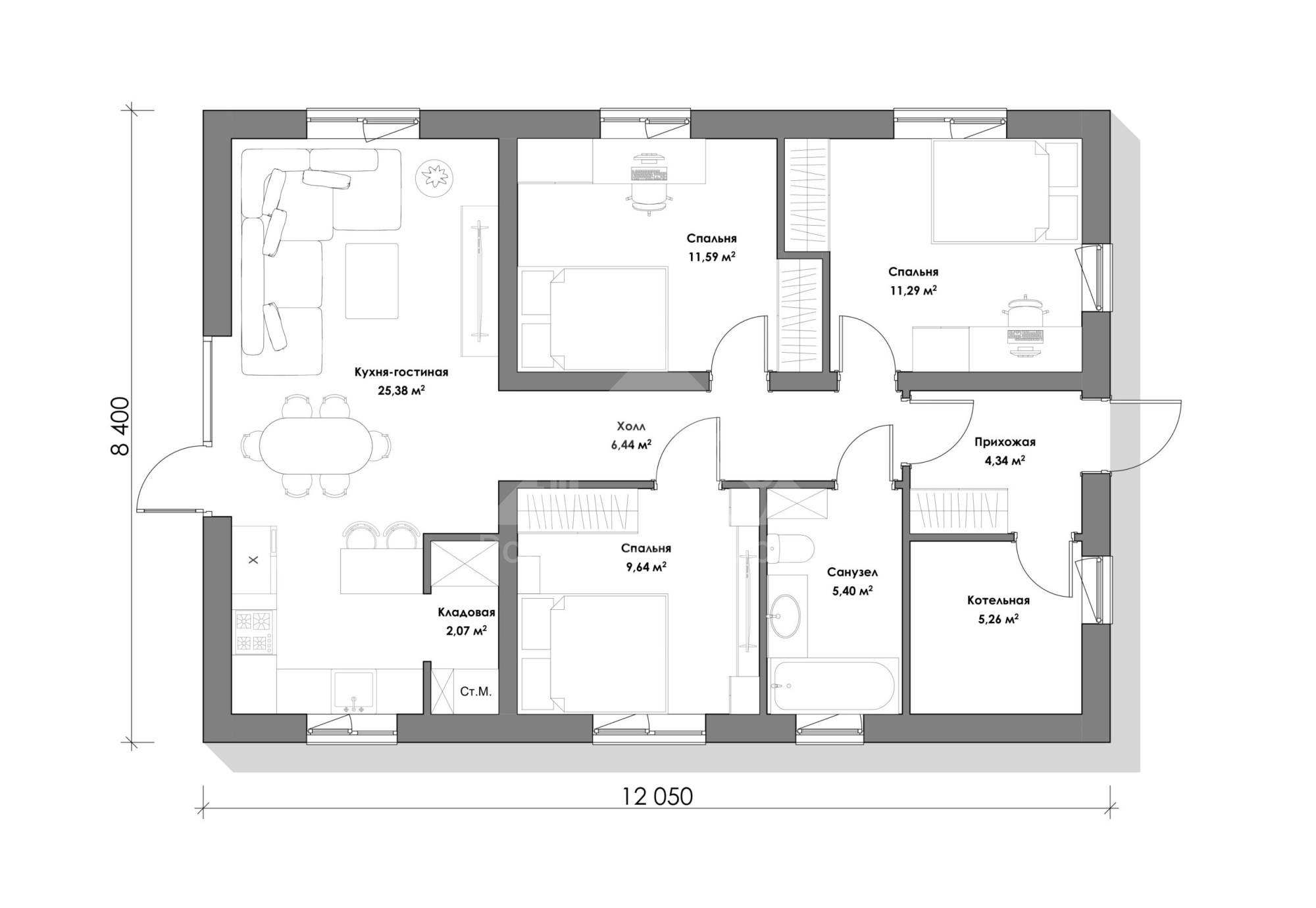 Номер объекта - 1738 Предлагаем к продаже авторский проект одноэтажного дома С-2 101 м². (Стоимость без участка) Отличный вариант для тех, кто планирует комфортное загородное проживание в спокойном и живописном месте. Готовы подробно ответить на все вопросы и предоставить дополнительную информацию. Звоните — будем рады помочь! В "Базовую" комплектацию дома входит полный закрытый теплый контур: • Подготовительные работы - Проект дома; Документы для БТИ; Оценка стройплощадки • Фундамент (зависит от участка) • Несущие стены газоблок / керамоблок / кирпич • Монолитный пояс • Перекрытия - Ширина плит перекрытия: 1-1,5м; Длина до 9 м.; Утепление торцов плит; Заделка швов • Утепленная кровля из металлочерепицы • Окна двухкамерные с тройным стеклопакетом • Металлическая входная дверь с зимним утеплителем Если вас заинтересовал дом — обращайтесь за подробностями. Всегда рады помочь. Помощь в получении кэшбека при покупке недвижимости, ипотеки, реализации материнского капитала и сертификатов. Гарантируем безопасность сделки.